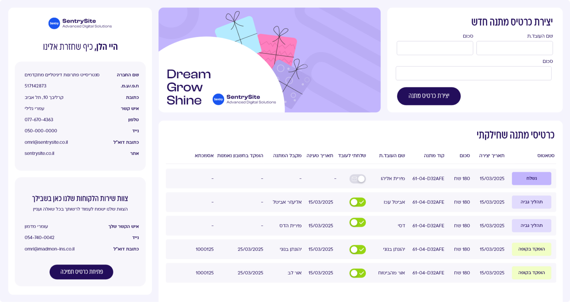 ממשק הניהול שלנו תוכנן ופותח במיוחד עבור פעילות כרטיסי המתנה לחברות וארגונים. בעזרתו תוכלו להזין את פרטי העובד, לקבל קוד מתנה באופן אוטומטי, ולעקוב אחר סטטוס המימוש בטבלת כרטיסי המתנה.